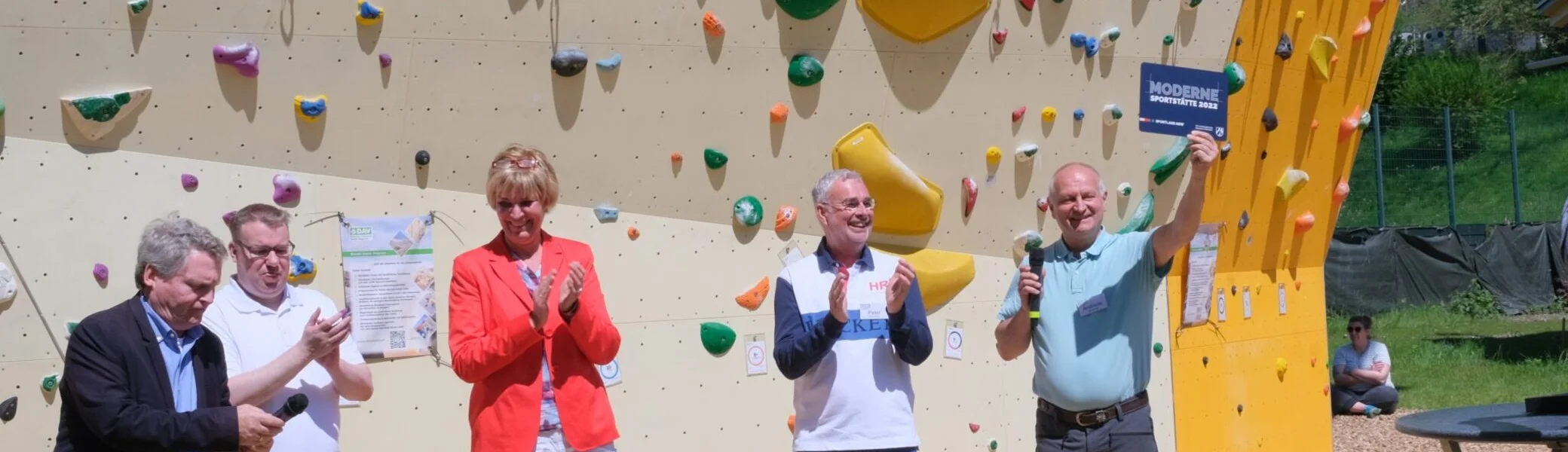 Detlef Berthold von der Staatskanzlei NRW und Referatsleiter Sportstättenbau beim Sportministerium NRW, Alexandra Szlagowski, Leiterin des Sport- und Bäderamtes der Stadt Wuppertal und Stefan Langerfeld vom Stadtsportbund überbrachten sportliche Grußworte, auch im Namen von Andrea Milz von der Staatskanzlei NRW sowie vom Oberbürgermeister der Stadt Wuppertal Uwe Schneidewind und Matthias Nocke vom Geschäftsbereich Sport und Kultur der Stadt Wuppertal, verbunden mit den besten Wünschen für viel Freude, Spaß und Erfolg an und mit der neuen Außenkletteranlage.