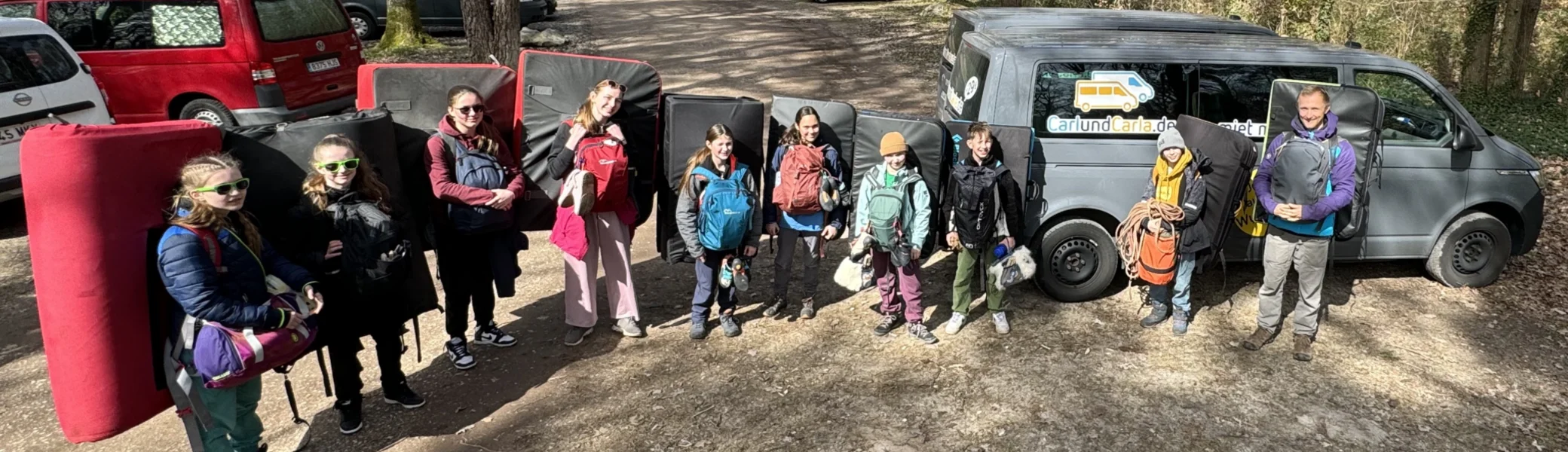 Als wir am nächsten Tag aufwachten, gingen wir wie ab jetzt jeden Morgen, zum Bäcker. Nach dem Frühstück hieß es Taschen packen und ab zum Bouldergebiet “91/1”. Im Gebiet angekommen wärmten wir uns auf, lernten das Spotten und wie man Crashpads richtig auslegt. Anschließend durften wir uns in Kleingruppen frei im Gebiet bewegen und bouldern. Zwischendurch konnten wir Pausen machen, in welchen wir aßen und quatschten.