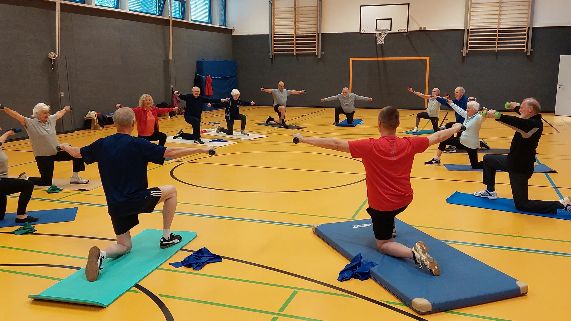 Nach einem Warm-up mit Gehen, Joggen und Dehnen folgt der Hauptteil mit funktionellen Übungen für Muskelaufbau und Beweglichkeit. Kleine Spiele und Zirkeltraining stärken koordinative Fähigkeiten und Ausdauer. Cool-down mit Dehnübungen. Gymnastik ist sicher und anpassbar an die Fitness.