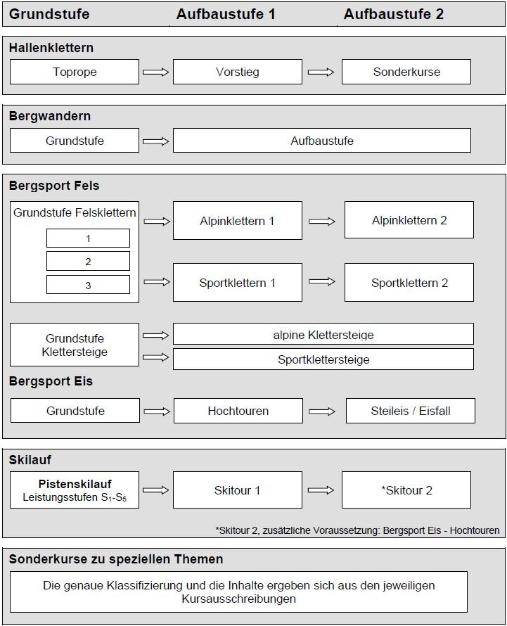 Die Teilnehmer*innen eines Kurses der Grundstufe benötigen keinerlei Berg-/ Kletterkenntnisse bzw. Erfahrungen. Dennoch sollten diese gesund sein und eine solide Grundkondition haben. Des Weiteren sollte die Bereitschaft vorhanden sein, in entsprechenden Gruppen die notwendigen Inhalte zu erlernen und umzusetzen. Kursziel der Grundstufe ist die Vermittlung einer soliden Basis in dem jeweiligen bergsportlichen Bereich, um an Kursen der Aufbaustufe 1 teilnehmen zu können.