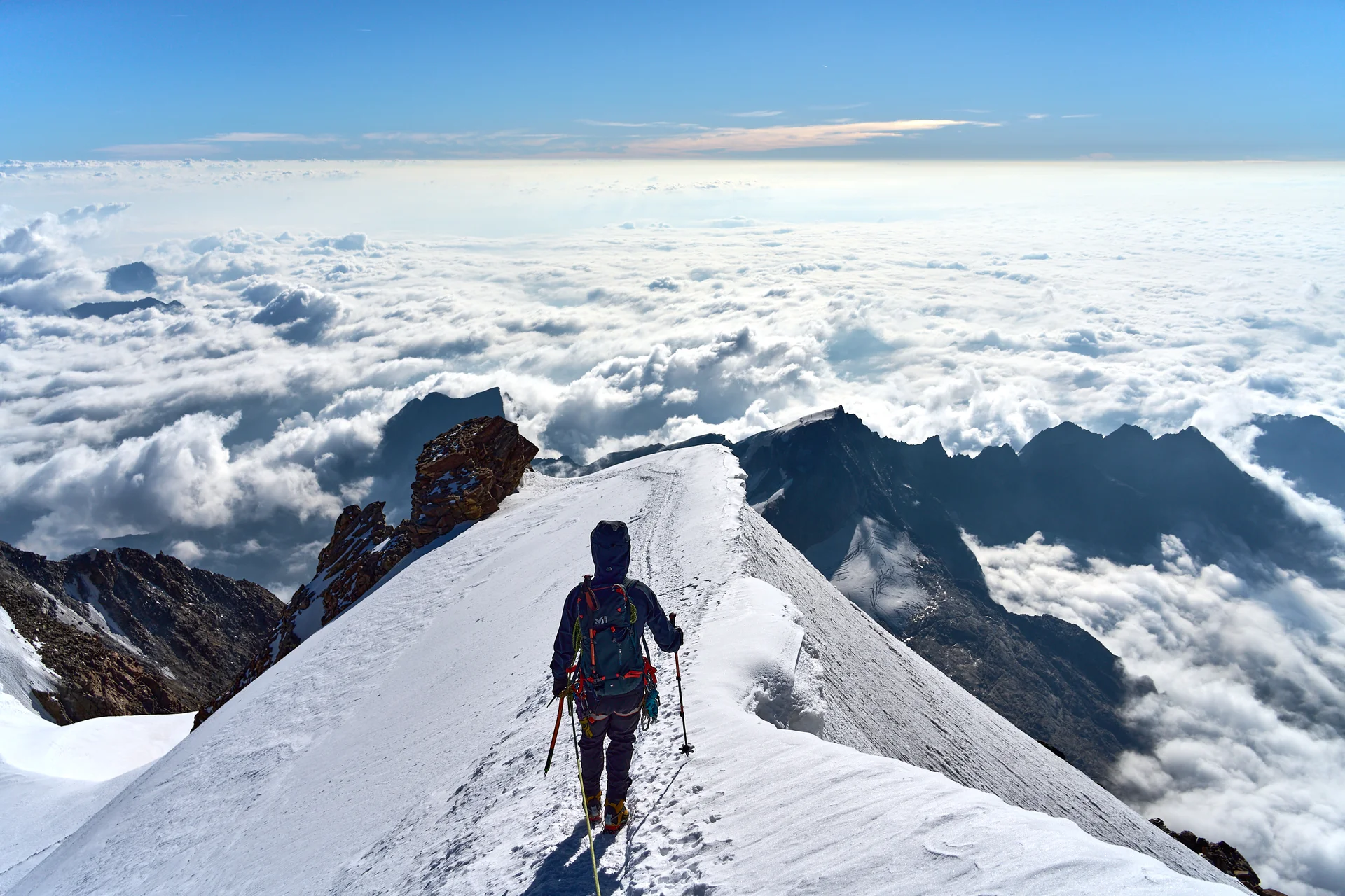 Klassische Hochtouren bringen uns auf die höchsten Dächer der Alpen. Die Touren führen meist durch wegloses, teilweise sehr ausgesetztes, hochalpines Gelände. Dazu gehören Kletterpassagen im Fels, Gletscherbegehungen mit Spaltenzonen oder auch steile Eis-/Firnflanken.